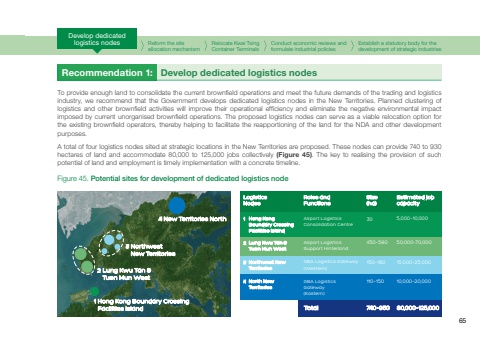 Figure 45. Potential sites for development of dedicated logistics nodeAirport Logistics Consolidation CentreLogisticsNodesRoles and FunctionsSize(ha)Estimated job capacityHong Kong 5,000–10,000Boundary Crossing Facilities Island1Airport Logistics Support HinterlandLung Kwu Tan & 50,000–70,000Tuen Mun West2GBA Logistics Gateway (Western) 15,000–25,000 Northwest New Territories 3 4 New Territories NorthHong Kong Boundary CrossingFacilities Island1NorthwestNew Territories3Lung Kwu Tan &Tuen Mun West2TotalGBA Logistics Gateway(Eastern)North New 10,000–20,000Territories4150–160450–590110–150740–930 80,000–125,00030Reform the siteallocation mechanismConduct economic reviews and formulate industrial policiesEstablish a statutory body for the development of strategic industriesRelocate Kwai Tsing Container TerminalsDevelop dedicatedlogistics nodesTo provide enough land to consolidate the current brownfield operations and meet the future demands of the trading and logistics industry, we recommend that the Government develops dedicated logistics nodes in the New Territories. Planned clustering of logistics and other brownfield activities will improve their operational efficiency and eliminate the negative environmental impact imposed by current unorganised brownfield operations. The proposed logistics nodes can serve as a viable relocation option for the existing brownfield operators, thereby helping to facilitate the reapportioning of the land for the NDA and other development purposes.A total of four logistics nodes sited at strategic locations in the New Territories are proposed. These nodes can provide 740 to 930 hectares of land and accommodate 80,000 to 125,000 jobs collectively (Figure 45). The key to realising the provision of such potential of land and employment is timely implementation with a concrete timeline.Recommendation 1: Develop dedicated logistics nodes65