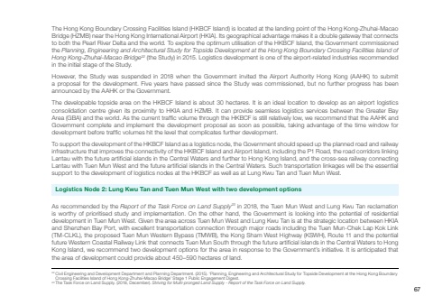 The Hong Kong Boundary Crossing Facilities Island (HKBCF Island) is located at the landing point of the Hong Kong-Zhuhai-Macao Bridge (HZMB) near the Hong Kong International Airport (HKIA). Its geographical advantage makes it a double gateway that connects to both the Pearl River Delta and the world. To explore the optimum utilisation of the HKBCF Island, the Government commissioned the Planning, Engineering and Architectural Study for Topside Development at the Hong Kong Boundary Crossing Facilities Island of Hong Kong-Zhuhai-Macao Bridge22 (the Study) in 2015. Logistics development is one of the airport-related industries recommended in the initial stage of the Study. However, the Study was suspended in 2018 when the Government invited the Airport Authority Hong Kong (AAHK) to submit a proposal for the development. Five years have passed since the Study was commissioned, but no further progress has been announced by the AAHK or the Government.The developable topside area on the HKBCF Island is about 30 hectares. It is an ideal location to develop as an airport logistics consolidation centre given its proximity to HKIA and HZMB. It can provide seamless logistics services between the Greater Bay Area (GBA) and the world. As the current traffic volume through the HKBCF is still relatively low, we recommend that the AAHK and Government complete and implement the development proposal as soon as possible, taking advantage of the time window for development before traffic volumes hit the level that complicates further development. To support the development of the HKBCF Island as a logistics node, the Government should speed up the planned road and railway infrastructure that improves the connectivity of the HKBCF Island and Airport Island, including the P1 Road, the road corridors linking Lantau with the future artificial islands in the Central Waters and further to Hong Kong Island, and the cross-sea railway connecting Lantau with Tuen Mun West and the future artificial islands in the Central Waters. Such transportation linkages will be the essential support to the development of logistics nodes at the HKBCF as well as at Lung Kwu Tan and Tuen Mun West.Logistics Node 2: Lung Kwu Tan and Tuen Mun West with two development options22 Civil Engineering and Development Department and Planning Department. (2015). ‘Planning, Engineering and Architectural Study for Topside Development at the Hong Kong Boundary Crossing Facilities Island of Hong Kong-Zhuhai-Macao Bridge’ Stage 1 Public Engagement Digest. 23 The Task Force on Land Supply. (2018, December). Striving for Multi-pronged Land Supply - Report of the Task Force on Land Supply. As recommended by the Report of the Task Force on Land Supply23 in 2018, the Tuen Mun West and Lung Kwu Tan reclamation is worthy of prioritised study and implementation. On the other hand, the Government is looking into the potential of residential development in Tuen Mun West. Given the area across Tuen Mun West and Lung Kwu Tan is at the strategic location between HKIA and Shenzhen Bay Port, with excellent transportation connection through major roads including the Tuen Mun-Chek Lap Kok Link (TM-CLKL), the proposed Tuen Mun Western Bypass (TMWB), the Kong Sham West Highway (KSWH), Route 11 and the potential future Western Coastal Railway Link that connects Tuen Mun South through the future artificial islands in the Central Waters to Hong Kong Island, we recommend two development options for the area in response to the Government’s initiative. It is anticipated that the area of development could provide about 450–590 hectares of land.67