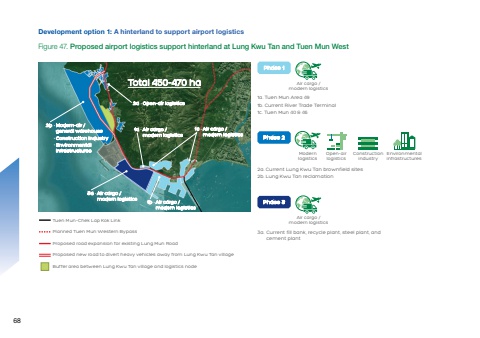 Figure 47. Proposed airport logistics support hinterland at Lung Kwu Tan and Tuen Mun WestTuen Mun–Chek Lap Kok LinkPlanned Tuen Mun Western BypassProposed road expansion for existing Lung Mun RoadProposed new road to divert heavy vehicles away from Lung Kwu Tan villageBuffer area between Lung Kwu Tan village and logistics node3a1b1c Air cargo / modern logisticsAir cargo / modern logisticsTotal 450-470 ha2b Modern-air / general warehouseConstruction industryEnvironmentalinfrastructures. Air cargo / modern logistics.. 1a Air cargo / modern logistics.2a .Open-air logistics1a. Tuen Mun Area 491b. Current River Trade Terminal1c. Tuen Mun 40 & 462a. Current Lung Kwu Tan brownfield sites2b. Lung Kwu Tan reclamation3a. Current fill bank, recycle plant, steel plant, andcement plantPhase 1Phase 2Phase 3Air cargo /modern logisticsAir cargo /modern logisticsModernlogisticsOpen-airlogisticsConstructionindustryEnvironmentalinfrastructuresDevelopment option 1: A hinterland to support airport logistics68