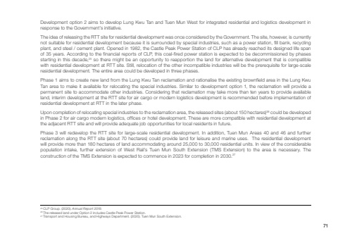 Development option 2 aims to develop Lung Kwu Tan and Tuen Mun West for integrated residential and logistics development in response to the Government’s initiative. The idea of releasing the RTT site for residential development was once considered by the Government. The site, however, is currently not suitable for residential development because it is surrounded by special industries, such as a power station, fill bank, recycling plant, and steel / cement plant. Opened in 1982, the Castle Peak Power Station of CLP has already reached its designed life span of 35 years. According to the financial reports of CLP, this coal-fired power station is expected to be decommissioned by phases starting in this decade,25 so there might be an opportunity to reapportion the land for alternative development that is compatible with residential development at RTT site. Still, relocation of the other incompatible industries will be the prerequisite for large-scale residential development. The entire area could be developed in three phases.Phase 1 aims to create new land from the Lung Kwu Tan reclamation and rationalise the existing brownfield area in the Lung Kwu Tan area to make it available for relocating the special industries. Similar to development option 1, the reclamation will provide a permanent site to accommodate other industries. Considering that reclamation may take more than ten years to provide available land, interim development at the RTT site for air cargo or modern logistics development is recommended before implementation of residential development at RTT in the later phase. Upon completion of relocating special industries to the reclamation area, the released sites (about 150 hectares)26 could be developed in Phase 2 for air cargo modern logistics, offices or hotel development. These are more compatible with residential development at the adjacent RTT site and will provide adequate job opportunities for local residents in future.Phase 3 will redevelop the RTT site for large-scale residential development. In addition, Tuen Mun Areas 40 and 46 and further reclamation along the RTT site (about 70 hectares) could provide land for leisure and marine uses. The residential development will provide more than 180 hectares of land accommodating around 25,000 to 30,000 residential units. In view of the considerable population intake, further extension of West Rail’s Tuen Mun South Extension (TMS Extension) to the area is necessary. The construction of the TMS Extension is expected to commence in 2023 for completion in 2030.2725 CLP Group. (2020). Annual Report 2019. 26 The released land under Option 2 includes Castle Peak Power Station. 27 Transport and Housing Bureau, and Highways Department. (2020). Tuen Mun South Extension.71