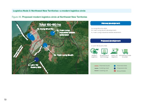 Figure 49. Proposed modern logistics circle at Northwest New Territories1a. Hung Shui Kiu NDA1b. Yuen Long South development1c. Yuen Long industrial estate extension2. Lam Tei Quarry SiteOpen-airlogisticsWholesale trade& outletEnterprise & Planned Tuen MunWestern BypasstechnologyPlanned Route 11Total 150-160 haY uen Lo ngHwyPlanned routeExisting roadExisting railPlanned sitesProposed siteBrownfieldsModernlogisticsProposed developmentPlanned development1a. Hung Shui Kiu 1c. Yuen Longindustrial estateextension1b. Yuen Long South2. Lam TeiQuarry SiteKong Sham Western HwyLogistics Node 3: Northwest New Territories—a modern logistics circle72