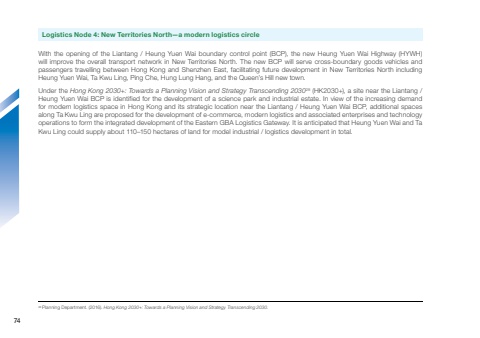 With the opening of the Liantang / Heung Yuen Wai boundary control point (BCP), the new Heung Yuen Wai Highway (HYWH) will improve the overall transport network in New Territories North. The new BCP will serve cross-boundary goods vehicles and passengers travelling between Hong Kong and Shenzhen East, facilitating future development in New Territories North including Heung Yuen Wai, Ta Kwu Ling, Ping Che, Hung Lung Hang, and the Queen’s Hill new town. Under the Hong Kong 2030+: Towards a Planning Vision and Strategy Transcending 203028 (HK2030+), a site near the Liantang / Heung Yuen Wai BCP is identified for the development of a science park and industrial estate. In view of the increasing demand for modern logistics space in Hong Kong and its strategic location near the Liantang / Heung Yuen Wai BCP, additional spaces along Ta Kwu Ling are proposed for the development of e-commerce, modern logistics and associated enterprises and technology operations to form the integrated development of the Eastern GBA Logistics Gateway. It is anticipated that Heung Yuen Wai and Ta Kwu Ling could supply about 110–150 hectares of land for model industrial / logistics development in total.28 Planning Department. (2016). Hong Kong 2030+: Towards a Planning Vision and Strategy Transcending 2030. Logistics Node 4: New Territories North—a modern logistics circle74