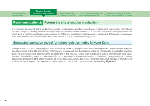 Reform the siteallocation mechanismIt is important to ensure that the land in these logistics nodes is allocated fairly to end users, including the vast number of small and medium enterprises (SMEs) and brownfield operators. Our second recommendation is to propose a comprehensive operation model which aims at building a well-balanced ecosystem for SMEs and established logistics property developers. This implies moving away from the traditional land auction model which allocates land purely based on bidding prices.Suggested operation model for future logistics nodes in Hong KongDevelop dedicatedlogistics nodesConduct economic reviews and formulate industrial policiesEstablish a statutory body for the development of strategic industriesRelocate Kwai Tsing Container TerminalsRecommendation 2: Reform the site allocation mechanismTaking reference from the managing of industrial estates by the Hong Kong Science and Technology Parks Corporation (HKSTP) and operation model of the JTC Corporation of Singapore, we propose that the logistics nodes be managed by a dedicated statutory body, whose mission is to spearhead the development of the industry. Rather than targeting the largest profit through land sales, the goal of establishing logistics nodes should focus on assisting the lessees and tenants, in the areas of upgrading their business capacity and maintaining the nodes' flexibility, so the nodes can accommodate new or emerging economic activities in the future. To achieve such policy goals, the operation model of logistics nodes should pay attention to the following (Figure 51):76