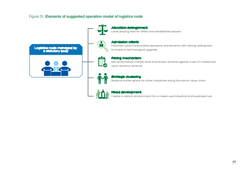 Figure 51. Elements of suggested operation model of logistics nodeAllocation arrangementLevel playing field for SMEs and established playersAdmission criteriaPrioritise current brownfield operators and tenants with strong willingness to invest in technological upgradePricing mechanismSet rental below market level and review tenants against a set of milestonesupon tenancy renewalStrategic clusteringReserve buffer space for other industries along the same value chainMixed developmentCreate a vibrant environment for a mixed-use industrial and business hubLogistics node managed bya statutory body77