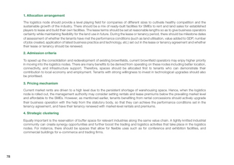 Equally important is the reservation of buffer space for relevant industries along the same value chain. A tightly knitted industrial community can create synergy opportunities and further boost the trading and logistics activities that take place in the logistics nodes. For instance, there should be spaces that allow for flexible uses such as for conference and exhibition facilities, and commercial buildings for e-commerce and trading firms.4. Strategic clusteringThe logistics node should provide a level playing field for companies of different sizes to cultivate healthy competition and the sustainable growth of the industry. There should be a mix of ready-built facilities for SMEs to rent and land sales for established players to lease and build their own facilities. The lease terms should be set at reasonable lengths so as to give business operators certainty while maintaining flexibility for the land use in future. During the lease or tenancy period, there should be milestone dates of assessment of whether the tenants have met the performance conditions (such as land utilisation, value added to GDP, number of jobs created, application of latest business practice and technology, etc.) set out in the lease or tenancy agreement and whether their lease or tenancy should be renewed.To speed up the consolidation and redevelopment of existing brownfields, current brownfield operators may enjoy higher priority in moving into the logistics nodes. There are many benefits to be derived from operating on these nodes including better location, connectivity, and infrastructure support. Therefore, spaces should be allocated first to tenants who can demonstrate their contribution to local economy and employment. Tenants with strong willingness to invest in technological upgrades should also be prioritised.Current market rents are driven to a high level due to the persistent shortage of warehousing space. Hence, when the logistics node is rolled out, the management authority may consider setting rentals and lease premiums below the prevailing market level and affordable to the SMEs. However, as mentioned earlier, tenants benefiting from rental concessions should actively upgrade their business operation with the help from the statutory body, so that they can achieve the performance conditions set in the tenancy agreement, and have their tenancy renewed with market-level rentals and premiums.1. Allocation arrangement2. Admission criteria3. Pricing mechanism78