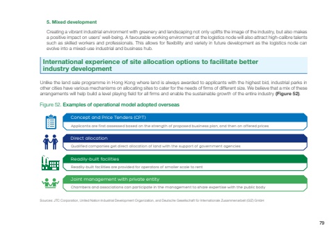 Figure 52. Examples of operational model adopted overseasSources: JTC Corporation, United Nation Industrial Development Organization, and Deutsche Gesellschaft für Internationale Zusammenarbeit (GIZ) GmbHReadily-built facilities are provided for operators of smaller scale to rentReadily-built facilitiesApplicants are first assessed based on the strength of proposed business plan, and then on offered pricesConcept and Price Tenders (CPT)Qualified companies get direct allocation of land with the support of government agenciesDirect allocationChambers and associations can participate in the management to share expertise with the public bodyJoint management with private entityCreating a vibrant industrial environment with greenery and landscaping not only uplifts the image of the industry, but also makes a positive impact on users’ well-being. A favourable working environment at the logistics node will also attract high-calibre talents such as skilled workers and professionals. This allows for flexibility and variety in future development as the logistics node can evolve into a mixed-use industrial and business hub.5. Mixed developmentInternational experience of site allocation options to facilitate better industry developmentUnlike the land sale programme in Hong Kong where land is always awarded to applicants with the highest bid, industrial parks in other cities have various mechanisms on allocating sites to cater for the needs of firms of different size. We believe that a mix of these arrangements will help build a level playing field for all firms and enable the sustainable growth of the entire industry (Figure 52).79