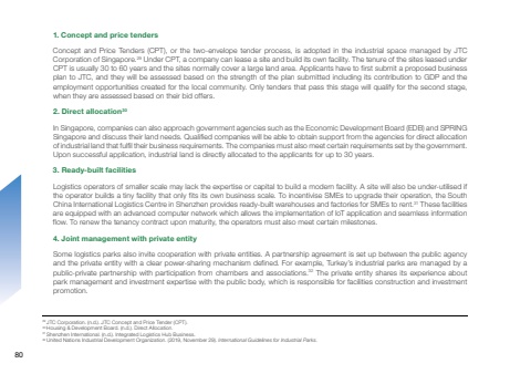 Some logistics parks also invite cooperation with private entities. A partnership agreement is set up between the public agency and the private entity with a clear power-sharing mechanism defined. For example, Turkey’s industrial parks are managed by a public-private partnership with participation from chambers and associations.32 The private entity shares its experience about park management and investment expertise with the public body, which is responsible for facilities construction and investment promotion.4. Joint management with private entityLogistics operators of smaller scale may lack the expertise or capital to build a modern facility. A site will also be under-utilised if the operator builds a tiny facility that only fits its own business scale. To incentivise SMEs to upgrade their operation, the South China International Logistics Centre in Shenzhen provides ready-built warehouses and factories for SMEs to rent.31 These facilities are equipped with an advanced computer network which allows the implementation of IoT application and seamless information flow. To renew the tenancy contract upon maturity, the operators must also meet certain milestones.3. Ready-built facilitiesConcept and Price Tenders (CPT), or the two-envelope tender process, is adopted in the industrial space managed by JTC Corporation of Singapore.29 Under CPT, a company can lease a site and build its own facility. The tenure of the sites leased under CPT is usually 30 to 60 years and the sites normally cover a large land area. Applicants have to first submit a proposed business plan to JTC, and they will be assessed based on the strength of the plan submitted including its contribution to GDP and the employment opportunities created for the local community. Only tenders that pass this stage will qualify for the second stage, when they are assessed based on their bid offers.In Singapore, companies can also approach government agencies such as the Economic Development Board (EDB) and SPRING Singapore and discuss their land needs. Qualified companies will be able to obtain support from the agencies for direct allocation of industrial land that fulfil their business requirements. The companies must also meet certain requirements set by the government. Upon successful application, industrial land is directly allocated to the applicants for up to 30 years.1. Concept and price tenders2. Direct allocation3029 JTC Corporation. (n.d.). JTC Concept and Price Tender (CPT). 30 Housing & Development Board. (n.d.). Direct Allocation. 31 Shenzhen International. (n.d.). Integrated Logistics Hub Business.32 United Nations Industrial Development Organization. (2019, November 29). International Guidelines for Industrial Parks.80
