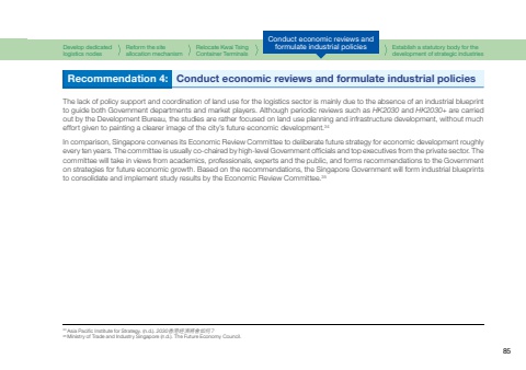 Develop dedicatedlogistics nodesReform the siteallocation mechanismConduct economic reviews andformulate industrial policies Establish a statutory body for the development of strategic industriesThe lack of policy support and coordination of land use for the logistics sector is mainly due to the absence of an industrial blueprint to guide both Government departments and market players. Although periodic reviews such as HK2030 and HK2030+ are carried out by the Development Bureau, the studies are rather focused on land use planning and infrastructure development, without much effort given to painting a clearer image of the city’s future economic development.34In comparison, Singapore convenes its Economic Review Committee to deliberate future strategy for economic development roughly every ten years. The committee is usually co-chaired by high-level Government officials and top executives from the private sector. The committee will take in views from academics, professionals, experts and the public, and forms recommendations to the Government on strategies for future economic growth. Based on the recommendations, the Singapore Government will form industrial blueprints to consolidate and implement study results by the Economic Review Committee.35Relocate Kwai Tsing Container Terminals34 Asia Pacific Institute for Strategy. (n.d.). 2030香港經濟將會如何? 35 Ministry of Trade and Industry Singapore (n.d.). The Future Economy Council. Recommendation 4: Conduct economic reviews and formulate industrial policies85