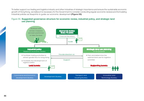 Figure 55. Suggested governance structure for economic review, industrial policy, and strategic land use planningBureaus withsimilar missionsare best positionedto take the leadTransport andHousing BureauInnovation andTechnology Bureau Development Bureau Commerce and EconomicDevelopment BureauIndustrial policyBased on economic reviewLead bureau Supporting bureauFacilitate trading activities to attract goods flow to Hong KongFacilitate the development of logistics SMEsStrategic land use planningFit for purposePlan and determine theoptimal land use for logisticsactivitiesProvide direction onSupportEconomic reviewEvery 10 yearsGuideFinancial SecretaryTo better support our trading and logistics industry and other industries of strategic importance and ensure the sustainable economic growth of Hong Kong, we believe it is necessary for the Government to consider conducting regular economic reviews and formulating industrial policies as blueprints to guide our economic development (Figure 55).86