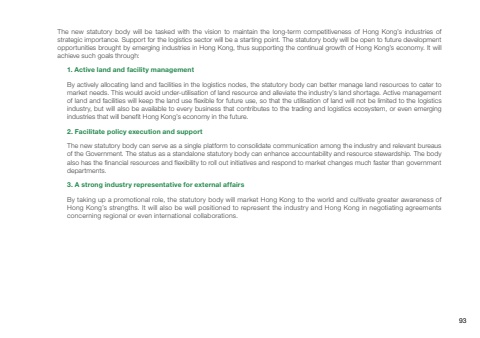 The new statutory body will be tasked with the vision to maintain the long-term competitiveness of Hong Kong’s industries of strategic importance. Support for the logistics sector will be a starting point. The statutory body will be open to future development opportunities brought by emerging industries in Hong Kong, thus supporting the continual growth of Hong Kong’s economy. It will achieve such goals through:By actively allocating land and facilities in the logistics nodes, the statutory body can better manage land resources to cater to market needs. This would avoid under-utilisation of land resource and alleviate the industry’s land shortage. Active management of land and facilities will keep the land use flexible for future use, so that the utilisation of land will not be limited to the logistics industry, but will also be available to every business that contributes to the trading and logistics ecosystem, or even emerging industries that will benefit Hong Kong’s economy in the future.The new statutory body can serve as a single platform to consolidate communication among the industry and relevant bureaus of the Government. The status as a standalone statutory body can enhance accountability and resource stewardship. The body also has the financial resources and flexibility to roll out initiatives and respond to market changes much faster than government departments.By taking up a promotional role, the statutory body will market Hong Kong to the world and cultivate greater awareness of Hong Kong’s strengths. It will also be well positioned to represent the industry and Hong Kong in negotiating agreements concerning regional or even international collaborations.1. Active land and facility management2. Facilitate policy execution and support3. A strong industry representative for external affairs93