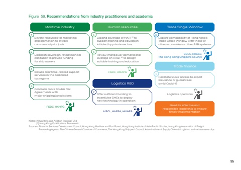 Logistics operatorsFSDC, HKIAPSAISCL, HAFFA, HKIAPSNeed for effective andresponsible leadership to ensuretimely implementationFigure 59. Recommendations from industry practitioners and academiaDevote resources for marketingand promotion to attractcommercial principals1[1] Maritime and Aviation Training Fund[2] Hong Kong Qualifications FrameworkSources: Financial Services Development Council, Hong Kong Maritime and Port Board, Hong Kong Institute of Asia-Pacific Studies, Hong Kong Association of Freight Forwarding Agents, The Chinese General Chamber of Commerce, The Hong Kong Shippers’ Council, Asian Institute of Supply Chains & Logistics, and various news clipsNotes:Maritime industryEstablish sovereign-rated financialinstitution to provide fundingfor ship owners2Include maritime-related supportservices in the dedicatedtax regime3Conclude more Double TaxAgreements withmajor shipping jurisdictions4Expand coverage of MATF[1] tosupport training and educationinitiated by private sectors5Human resourcesOffer sufficient funding toincentivise SMEs to deploynew technology in operation7Logistics R&DReview manpower demand andleverage on HKQF[2] to designsuitable training and education6FSDC, HKMPBCGCC, HKGCC,The Hong Kong Shippers CouncilTrade Single WindowExplore compatibility of Hong Kong’sTrade Single Window with those ofother economies or other B2B systems8Trade financeFacilitate SMEs’ access to exportinsurance or guaranteesamid Covid-19995