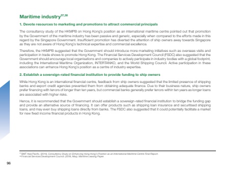 Maritime industry37,38The consultancy study of the HKMPB on Hong Kong’s position as an international maritime centre pointed out that promotion by the Government of the maritime industry has been passive and generic, especially when compared to the efforts made in this regard by the Singapore Government. Insufficient promotion has diverted the attention of ship owners away towards Singapore as they are not aware of Hong Kong’s technical expertise and commercial excellence. Therefore, the HKMPB suggested that the Government should introduce more marketing initiatives such as overseas visits and participation in trade shows to promote Hong Kong. The Financial Services Development Council (FSDC) also suggested that the Government should encourage local organisations and companies to actively participate in industry bodies with a global footprint, including the International Maritime Organization, INTERTANKO, and the World Shipping Council. Active participation in these associations can enhance Hong Kong’s position as a centre of industry expertise.While Hong Kong is an international financial centre, feedback from ship owners suggested that the limited presence of shipping banks and export credit agencies prevented them from obtaining adequate finance. Due to their business nature, ship owners prefer financing with tenors of longer than ten years, but commercial banks generally prefer tenors within ten years as longer loans are associated with higher risks.Hence, it is recommended that the Government should establish a sovereign-rated financial institution to bridge the funding gap and provide an alternative source of financing. It can offer products such as shipping loan insurance and securitised shipping loans, and may even buy shipping loans directly from banks. The FSDC also suggested that it could potentially facilitate a market for new fixed income financial products in Hong Kong.1. Devote resources to marketing and promotions to attract commercial principals2. Establish a sovereign-rated financial institution to provide funding to ship owners37 BMT Asia Pacific. (2014). Consultancy Study on Enhancing Hong Kong’s Position as an International Maritime Centre Final Report. 38 Financial Services Development Council. (2018, May). Maritime Leasing Paper.96