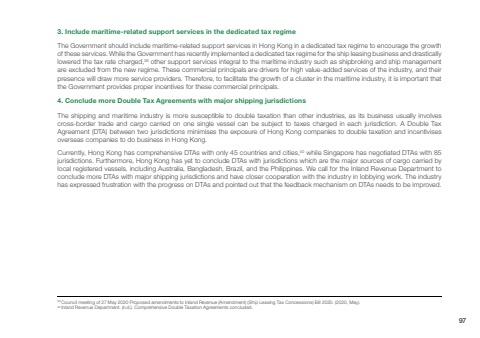The Government should include maritime-related support services in Hong Kong in a dedicated tax regime to encourage the growth of these services. While the Government has recently implemented a dedicated tax regime for the ship leasing business and drastically lowered the tax rate charged,39 other support services integral to the maritime industry such as shipbroking and ship management are excluded from the new regime. These commercial principals are drivers for high value-added services of the industry, and their presence will draw more service providers. Therefore, to facilitate the growth of a cluster in the maritime industry, it is important that the Government provides proper incentives for these commercial principals.The shipping and maritime industry is more susceptible to double taxation than other industries, as its business usually involves cross-border trade and cargo carried on one single vessel can be subject to taxes charged in each jurisdiction. A Double Tax Agreement (DTA) between two jurisdictions minimises the exposure of Hong Kong companies to double taxation and incentivises overseas companies to do business in Hong Kong.Currently, Hong Kong has comprehensive DTAs with only 45 countries and cities,40 while Singapore has negotiated DTAs with 85 jurisdictions. Furthermore, Hong Kong has yet to conclude DTAs with jurisdictions which are the major sources of cargo carried by local registered vessels, including Australia, Bangladesh, Brazil, and the Philippines. We call for the Inland Revenue Department to conclude more DTAs with major shipping jurisdictions and have closer cooperation with the industry in lobbying work. The industry has expressed frustration with the progress on DTAs and pointed out that the feedback mechanism on DTAs needs to be improved.3. Include maritime-related support services in the dedicated tax regime4. Conclude more Double Tax Agreements with major shipping jurisdictions 39 Council meeting of 27 May 2020 Proposed amendments to Inland Revenue (Amendment) (Ship Leasing Tax Concessions) Bill 2020. (2020, May). 40 Inland Revenue Department. (n.d.). Comprehensive Double Taxation Agreements concluded.97