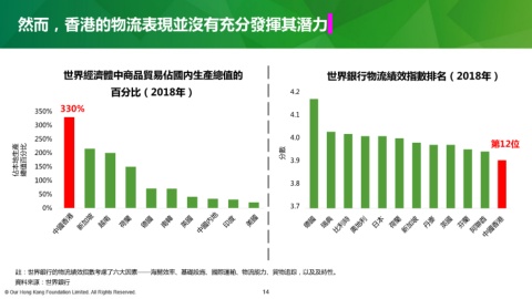 然而,香港的物流表現並沒有充分發揮其潛力 世界經濟體中商品貿易佔國內生產總值的 世界銀行物流績效指數排名(2018年) 百分比(2018年) 4.2 350% 330% 4.1 300% 250% 4.0 第12位 佔本地生產 總值百分比 200% 分數 3.9 150% 100% 3.8 50% 0% 3.7 註:世界銀行的物流績效指數考慮了六大因素——海關效率、基礎設施、國際運輸、物流能力、貨物追踪,以及及時性。 資料來源:世界銀行 14