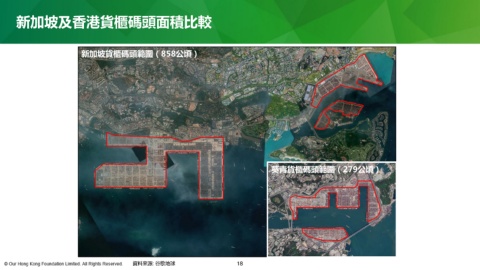 新加坡及香港貨櫃碼頭面積比較 新加坡貨櫃碼頭範圍(858公頃) 葵青貨櫃碼頭範圍(279公頃) 資料來源: 谷歌地球 18