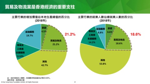 貿易及物流業是香港經濟的重要支柱 主要行業的增加價值佔本地生產總值的百分比 主要行業的就業人數佔總就業人數的百分比 (2018年) (2018年) 旅遊 金融服務 旅遊 金融服務 4.5% 專業及 6.8% 6.6% 19.7% 21.2% 工商業 18.6% 支援服務 貿易及物流 貿易及物流 14.2% 18.6% 專業及 21.2% 工商業 支援服務 12.0% 其他 其他 53.8% 42.7% 註:由於四捨五入關係,各項數字相加後未必等於100%。 資料來源:政府統計處 2
