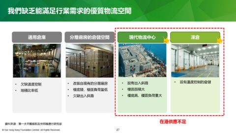 我們缺乏能滿足行業需求的優質物流空間 通用倉庫 分層廠房的倉儲空間 現代物流中心 凍倉 • 欠缺溫度控制 • 改裝自現有的分層廠房 • 設有出入斜路 • 設有溫度控制的倉儲 • 地積比率低 • 樓底矮、樓面負荷量低 • 樓面面積大 • 欠缺出入斜路 • 樓底高、樓面負荷量大 在港供應不足 資料來源:第一太平戴維斯及世邦魏理仕研究部 27
