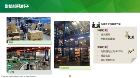 增值服務例子 行業特定的解決方案 時裝行業 • 掛衣運輸 • 無皺服裝運輸 包裝 餐飲行業 • 先到期先出貨 (FEFO) • 禮品包裝 • 節日禮籃組裝 質量控制 分揀 29