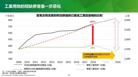 推算的本地生產總值附加價埴 (左軸) 推算工業用地* (右軸)