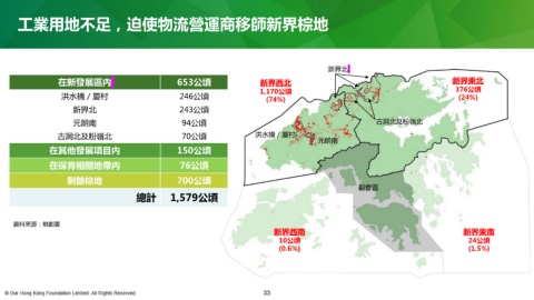 工業用地不足,迫使物流營運商移師新界棕地 新界北 在新發展區內 653公頃 新界西北 新界東北 1,170公頃 376公頃 洪水橋/厦村 246公頃 (74%) (24%) 新界北 243公頃 元朗南 94公頃 古洞北及粉嶺北 古洞北及粉嶺北 70公頃 洪水橋/厦村 元朗南 在其他發展項目內 150公頃 在保育相關地帶內 76公頃 剩餘棕地 700公頃 都會區 總計 1,579公頃 資料來源:規劃署 新界西南 新界東南 10公頃 24公頃 (0.6%) (1.5%) 33