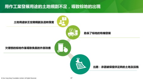 用作工業發展用途的土地規劃不足,導致棕地的出現 土地用途缺乏定期規劃及適時落實 助長了棕地的有機發展 欠理想的棕地作業導致負面的外部效應 出路:承諾確保提供足夠的土地及設施 37