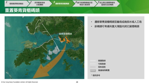 1 2 改革產業用地 3 4 進行經濟策略檢討並 5 成立專注發展策略性 發展專用物流樞紐 遷移葵青貨櫃碼頭 分配機制 制定行業政策 產業的法定機構 重置葵青貨櫃碼頭 • 遷移葵青貨櫃碼頭至離島或南部水域人工島 • 新碼頭可考慮共置大灣區內其它貨櫃碼頭 葵青貨櫃碼頭 葵青貨櫃碼頭 擬議路線 可能路線 現有道路 擬議填海範圍 桂山島 長洲南 * 僅供參考 48