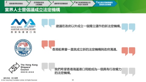 1 2 改革產業用地 3 4 進行經濟策略檢討並 5 成立專注發展策略性 發展專用物流樞紐 遷移葵青貨櫃碼頭 分配機制 制定行業政策 產業的法定機構 業界人士曾倡議成立法定機構 建議在政府以外成立一個獨立運作的新法定機構。 香港船東會一直就成立新的法定機構與政府溝通。 我們希望香港海運港口局能成為一個具有行政權力 的法定機構。 資料來源:各大報章 51