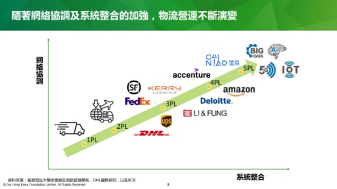 隨著網絡協調及系統整合的加強,物流營運不斷演變 網 絡 5PL 協 調 4PL 3PL 2PL 1PL 系統整合 資料來源:香港恆生大學供應鍊及資訊管理學系、DHL趨勢研究,以及BCR 8